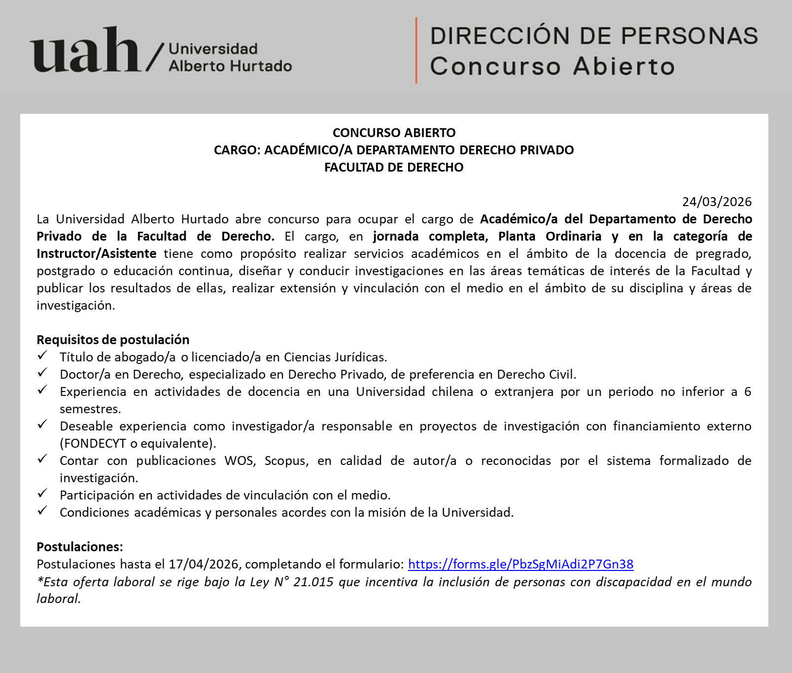Postulaciones hasta el 17/04/2026 en el siguiente formulario. Consultas a tvidela@uahurtado.cl.